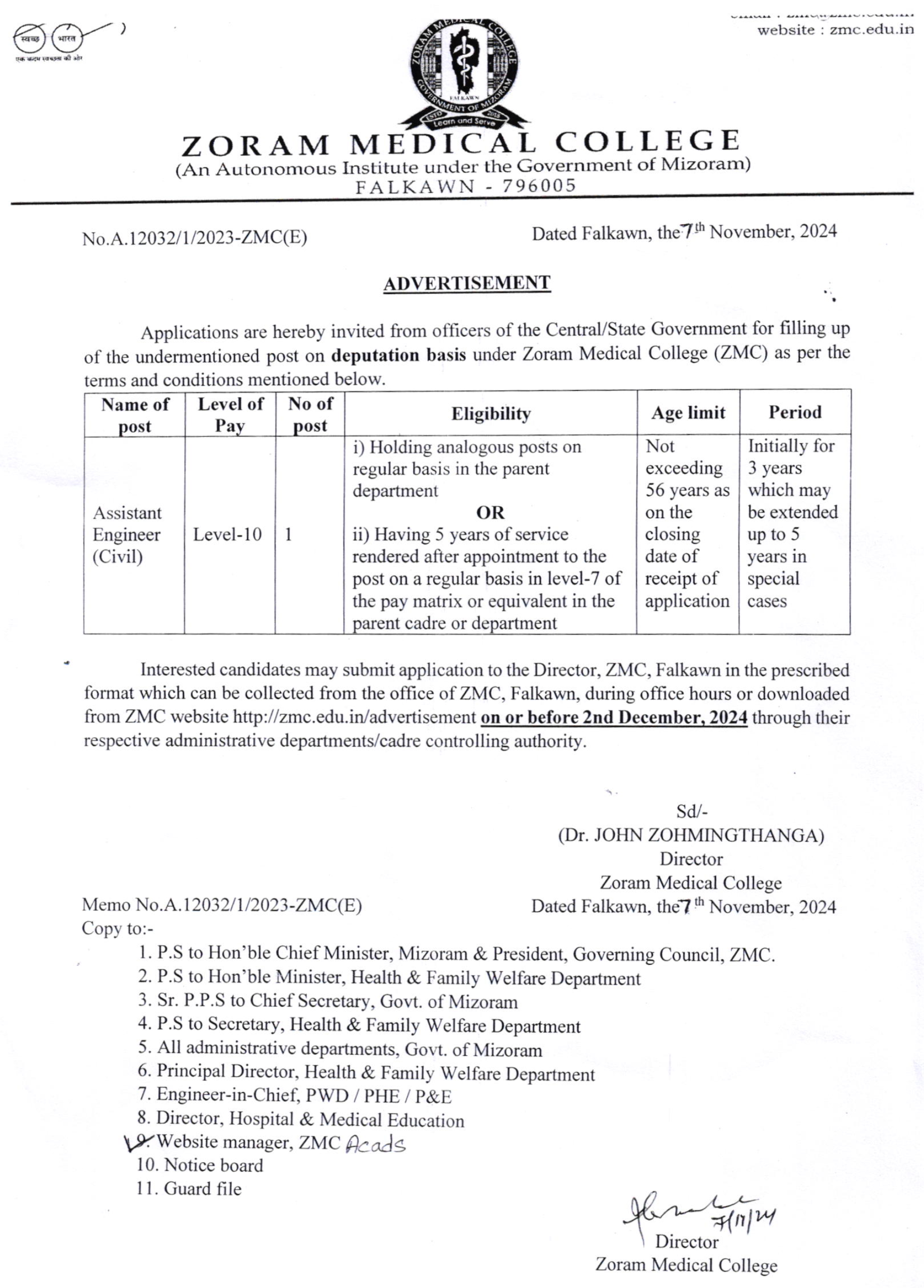 Advertisement - Asst Engineer (Civil), ZMC