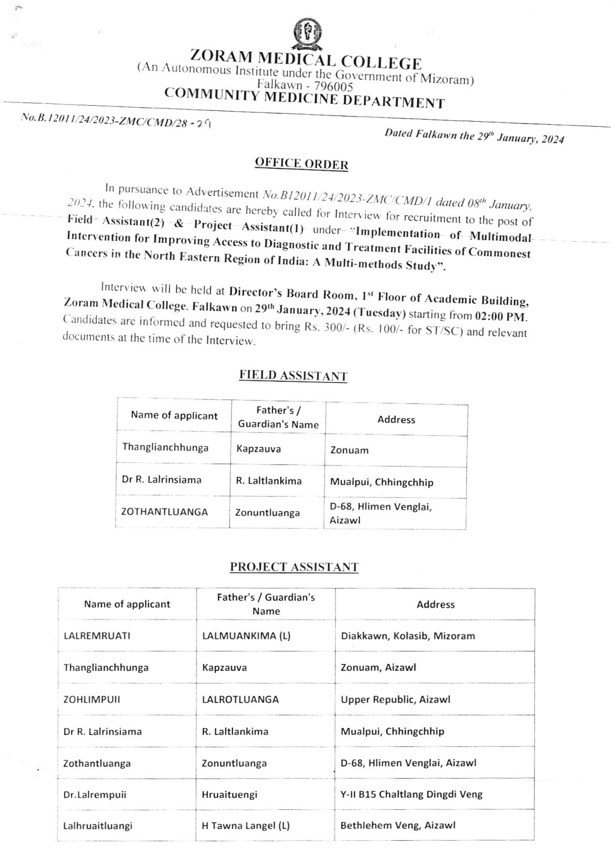 Interview Notice - Field Assistant & Project Assistant - ICMR-NCDIR under ZMC