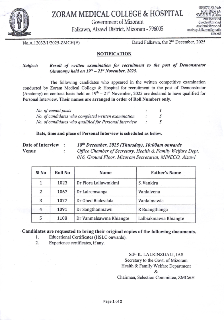 Notification - Demonstrator (Anatomy), Written Result & Interview Notice