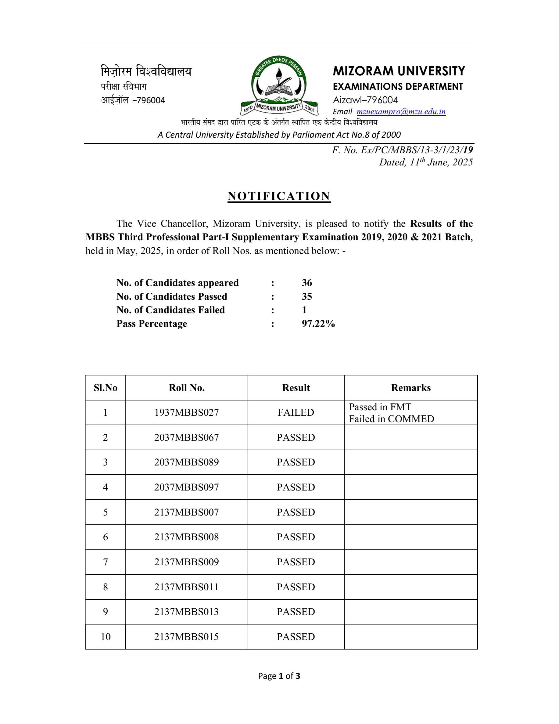 Results - MBBS 3rd Prof Part-I Supplementary Exam (2019,2020&2021)